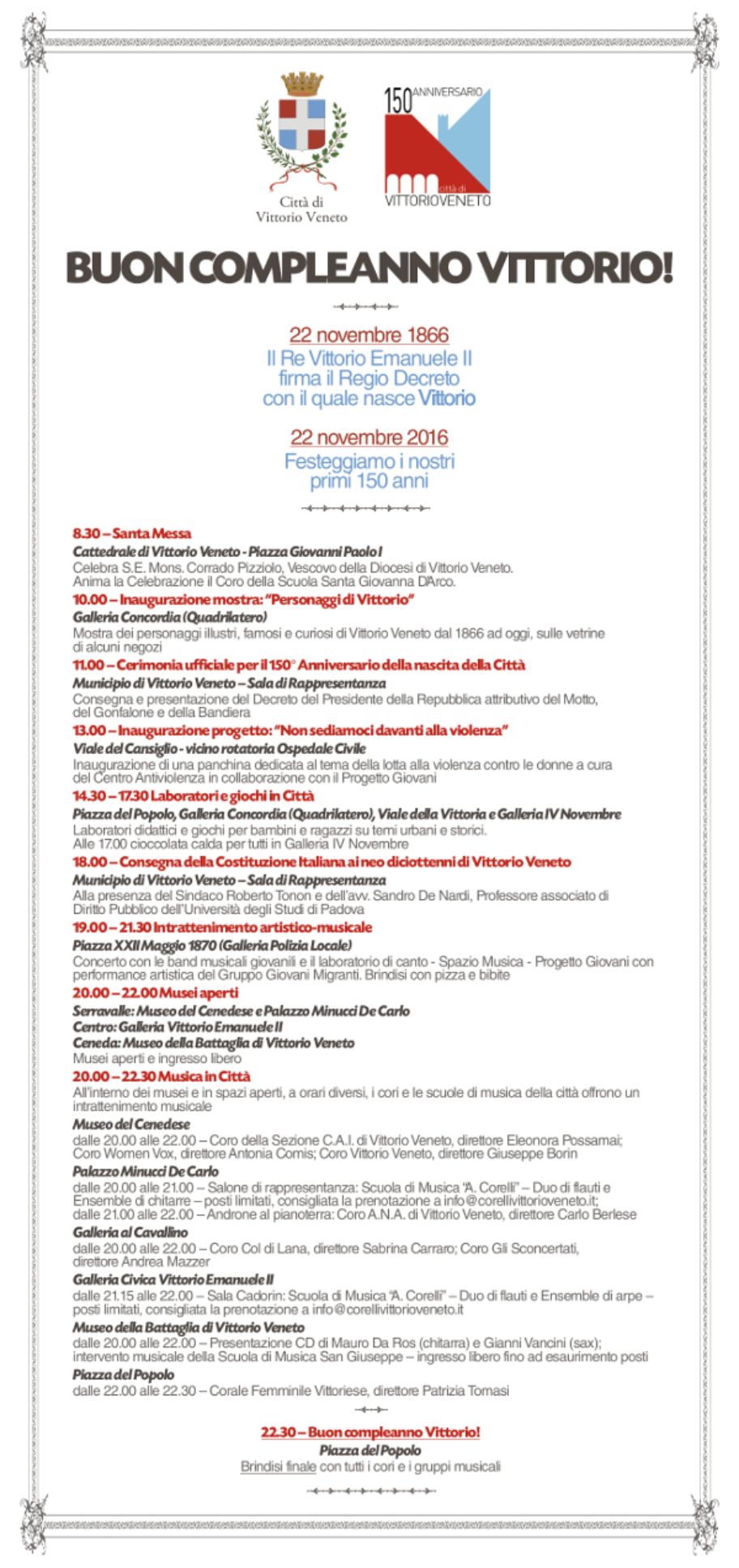 Martedì 22 novembre, in occasione del 150° anniversario della nascita di Vittorio Veneto, l'Amministrazione comunale propone un ricco programma di eventi e attività per tutta la cittadinanza.