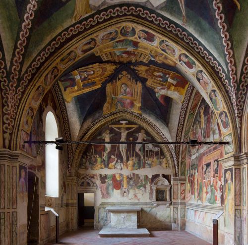 L’interno dell’Oratorio è decorato da un ciclo molto suggestivo di affreschi realizzati nel corso della prima metà circa del XV secolo da diversi artisti, riferibili alla cosiddetta “pittura gotico devozionale”; essi raffigurano gli Evangelisti e quattro Dottori della Chiesa sulle volte delle due campate, le Storie di S. Lorenzo e le Storie di S. Marco lungo le pareti ed una splendida Crocifissione presso l’altare.