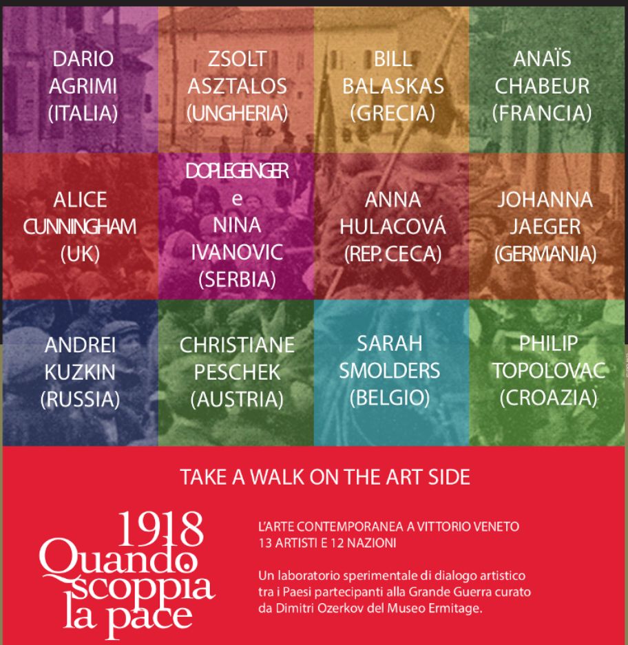 Nel Centenario della Pace, a Vittorio Veneto si inaugureranno le 13 opere d'arte contemporanea dei giovani artisti internazionali che sono stati coinvolti in questo progetto. 13 opere che saranno posizionate in tutta la città, rendendola una sorta di padiglione della Biennale permanente e accessibile liberamente a tutti. 13 opere che sono ispirate al tema scelto dalla città per il Centenario, "Quando scoppia la pace".